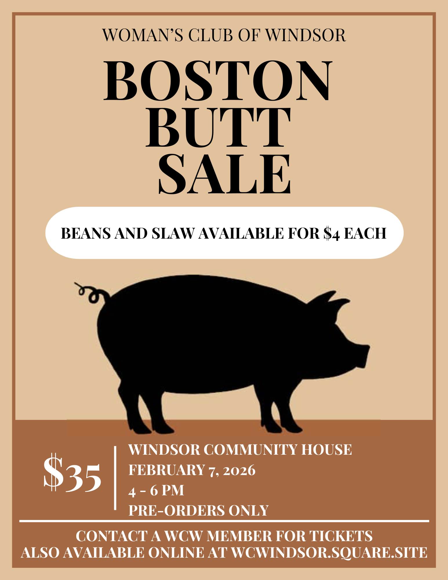 The Woman's Club of Windsor is pleased to announce the opening of pre-sales for Boston Butts 2026! Physical tickets are available from club members and online orders can be placed at https://wcwindsor.square.site/. Boston Butts tickets are a perfect stocking stuffer, and the Butts themselves are a fantastic Super Bowl Sunday highlight. Pickup will be on February 7th from 4-6 PM at the Windsor Community House.