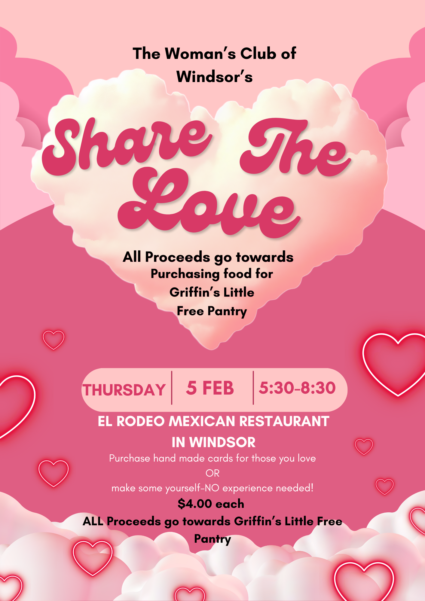 Join us on February 5 from 5:30 pm - 8:30 pm at El Rodeo in Windsor. We will have beautiful, handmade cards for sale for $4, or you can try your hand at making your own! All proceeds will go towards the Griffin's Little Free Pantry. Take this opportunity to show love to those you hold dear and support a great cause!